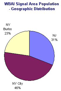 by Andrew Norris [WBAI local advisory board member] June 2002 (revise #2, December 2002) Summary: Based on an FCC map the WBAI Signal Area is identified as comprising 18 counties in three identifiable sub-areas: New York City (NYC), New Jersey (NJ), and suburban New York State (NYS). The 2000 US Census data on population and race for the 18 counties is tabulated. The signal area population is 17.4 million (M), with 8.0M, 5.4M and 4.0M in NYC, NJ and NYS, respectively. The signal area population is approximately 60:20:20:10 white:black:Hispanic/Latino:Asian (the total exceeds 100 because the categories are not exclusive; specifically, Hispanic/Latino is not a race). The breakdown for the sub-areas are 45:27:27:10 for NYC, 58:14:17:7 for NJ and 80:10:12:4 for the NY suburbs. Most of the population in the WBAI signal area live outside NYC. However, most of the black/African-American and Hispanic/Latino population in the signal area are to be found within NYC.