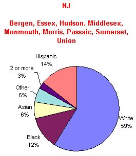 ![]() The counties with the greatest and least percentage of black or African American population are both in NJ. Essex county, the home of the city of Newark, has 41.2%, and Morris county has 2.8%. NJ also has the county with the least Hispanic/Latino percentage, Monmouth at 6.2%, and the county with the second largest percentage, Hudson at 39.8%. Only the Bronx has a greater percentage: 48.4%. Based on these numbers and the table, the New Jersey signal area could be characterized as more segregated* than NYC and NYS (apartheid might be a better description) but not significantly less racially diverse (in fact, more so in comparison with the NY burbs). The numbers for "some other race" are significant: 9.2% for the signal area, which exceeds the Asian percentage, 7.7%. I am not sure what to make of this. Appendix The table below is based on the map and data from the US Census for 2000. For each of the 18 counties in NJ, NYC and NY Suburbs, I have taken the data on racial distribution. The census identifies 7 race categories: (1) white, (2) black or African American, (3) American Indian and native Alaskan, (4) Asian, (5) native Hawaiian and other Pacific islander, (6) some other race, (7) two or more races. Note that the census does not classify Hispanic or Latino as a "race". It should be noted that the percentage figures in the Table do not agree with those in the charts on pages 1, 3 and 4. The reason is, again, due to the fact that Hispanic/Latino is not a "race", and that the percentage figures in the Table (as in the US census data) add to 100 without the Hispanic/Latino figure. When the latter is included in a pie-chart for comparison with the other figures, the net effect is that all percentage figures are reduced (by an amount that is easily determined). Thus, the pie charts are not to be construed as a breakdown of the total population, which is represented by the pie minus the Hispanic/Latino slice. Note: the "slices" for native American and Hawaiian populations are not shown in the pie charts for purposes of clarity only. The bottom line: the data is in the Table, everything else is imagery (one of the reasons charts were avoided in the first version of this document).