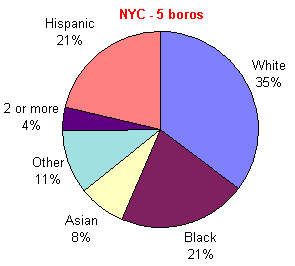 ![]() As expected, NYC exhibits the greatest racial diversity. Of the three sub-areas it is the only one in which whites are a "minority". The table does not show it, but it can be easily calculated from the data shown, that 64% of blacks and African Americans in the signal area live in NYC. Similarly, 61% of the Hispanic/Latino population resides in NYC. Thus, while most of the population in the WBAI signal area live outside NYC, most of the so-called "minority" population is within the City.